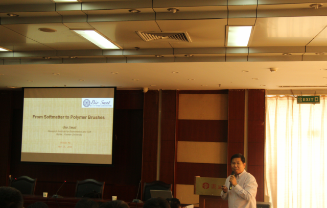 厦门大学吴晨旭教授做了题目为“软物质及其界面聚合物体系”学术报告。报告上,吴晨旭老师给我们从介绍什么是软物质,到软物质的实际应用,介绍了软硬物质的组合、不同聚合物之间的组合等方面展现软物质及其界面聚合物体系。