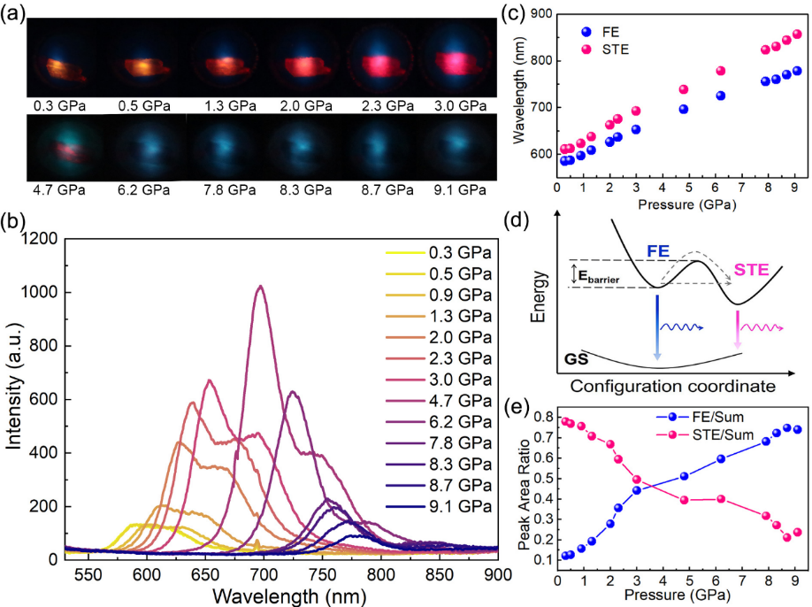 进展一:钙钛矿材料中的载流子超快动力学行为一直以来备受关注。刘才龙教授团队利用高压原位稳态光致发光、稳态吸收和飞秒瞬态吸收光谱探测技术,对CsPbBr3量子点压致电子态转变、荧光猝灭和带隙演化中的超快动力学行为进行了实验探究。研究发现,高压原位飞秒瞬态吸收光谱可以有效区分混合电子态,并获得压力依赖的载流子超快动力学寿命,揭示了CsPbBr3量子点压致荧光猝灭和消失的微观物理机制。这项工作对于改善钙钛矿材料的光物理性能至关重要,为拓宽其在光电探测器、发光二极管和太阳能电池等领域的应用提供了重要的指导。相关研究成果以“Ultrafast Dynamics across Pressure-Induced Electronic State Transitions, Fluorescence Quenching, and Bandgap Evolution in CsPbBr3 Quantum Dots”(CsPbBr3量子点在压力诱导的电子态转变,荧光猝灭和带隙演化过程中的超快动力学)为题发表在《Advanced Science》(《先进科学》)上。2021级硕士生陈林和楚亚博士为共同第一作者,张海娃博士、郑州大学郭海中教授和刘才龙教授为共同通讯作者,永利集团304am官方入口为第一署名单位。