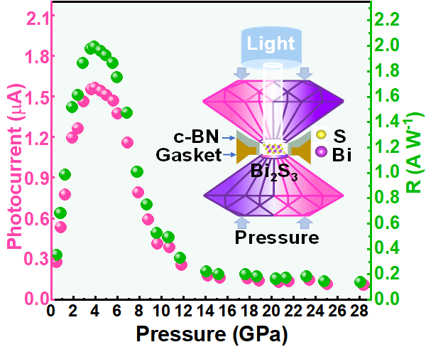 Bi2S3具有低毒性、低合成成本、吸收系数及载流子迁移率高等优点,成为光电探测器的潜在候选者。然而,由于其电子-空穴复合速度快和光腐蚀等影响降低了其光敏行为。为克服这一挑战,刘才龙教授团队提出压力调控Bi2S3光电响应的方案。通过将高压原位光电流、变温电阻率、拉曼散射光谱、可见吸收光谱测量和理论计算方法相结合,系统研究了压力作用下Bi2S3的光电、电输运、振动模式和能带结构。研究发现,压力作用下Bi2S3显示出两种不同的光响应信号(正/负光电流),0.5~4.0GPa范围内光电流随压力的增加出现显著增强(最大值约为初始值的5.6倍)。在30.3GPa以上,Bi2S3呈现负光电流响应,可归因于压致金属化相变引起的光热效应。研究结果为调控Bi2S3的光电性能提供了新思路,为优化基于Bi2S3光电子器件提供了更多的可能性。相关成果以“Pressure-induced photo responsiveness enhancement and positive–negative switch in Bi2S3(Bi2S3中的压力诱导光响应增强和正负光电流转换)”为题发表在《Applied Physics Letters》(《应用物理快报》)上。2021级硕士研究生冯浩铖和张国召博士为论文共同第一作者,王光宇博士、房媛媛副教授和冯振豹副教授为共同通讯作者,永利集团304am官方入口为第一署名单位。