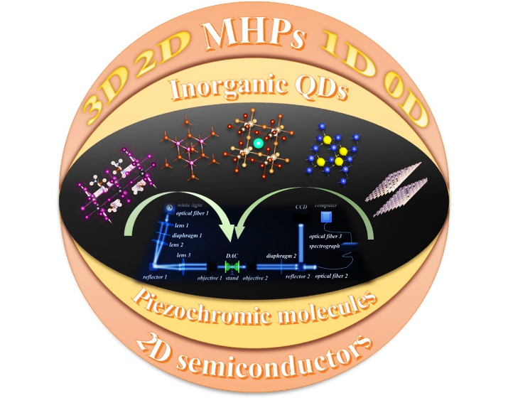 进展三:近年来,压力诱导带隙调节作为一种新颖而有效的手段,揭示了固有能带性质和深层结构-性能的关系。基于几种典型的半导体材料,包括金属卤化物钙钛矿、无机量子点、压致变色分子化合物和二维半导体材料,刘才龙教授团队概述了利用显微稳态紫外-可见吸收光谱技术的压力诱导带隙响应的系列研究,总结了高压条件下结构对带隙演变的影响以及带隙工程的一般原理,为环境条件下的材料设计提供指导。相关研究成果以“A review: comprehensive investigation on bandgap engineering under high pressure utilizing microscopic UV-Vis absorption spectroscopy(评论:关于利用微区紫外-可见吸收光谱技术在高压下进行能隙工程研究的综合调查)”为题发表在《APL Materials》(《APL材料》)上。2021级硕士生陈林为论文第一作者,张海娃博士、李茜教授和刘才龙教授为共同通讯作者,永利集团304am官方入口为唯一署名单位。